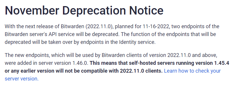 将由 2022.11.0 及更高版本的 Bitwarden 客户端使用的新端点已添加到服务器版本 1.46.0 中。这意味着运行 1.45.4 版或任何更早版本的自托管服务器将与 2022.11.0 客户端不兼容。